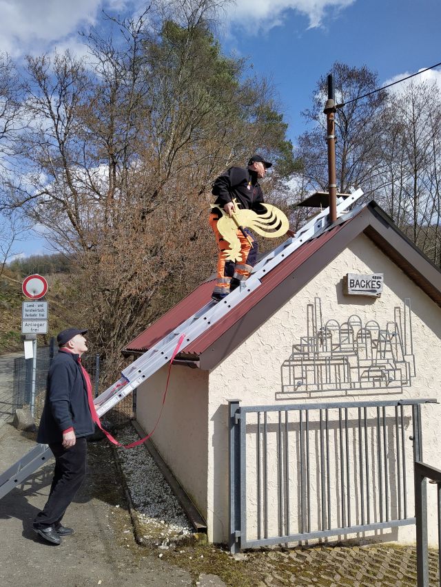 | 2021 | Güggel- (Wetterhahn-) Montage auf dem Backes: 1981 fand der Güggel, welcher viele Jahrzente den Turm der alten Schule in Struthütten geziert hatte bei den Bergknappensängern eine neue Heimat. 2021 wurde er für alle sichtbar auf dem Backes montiert. |