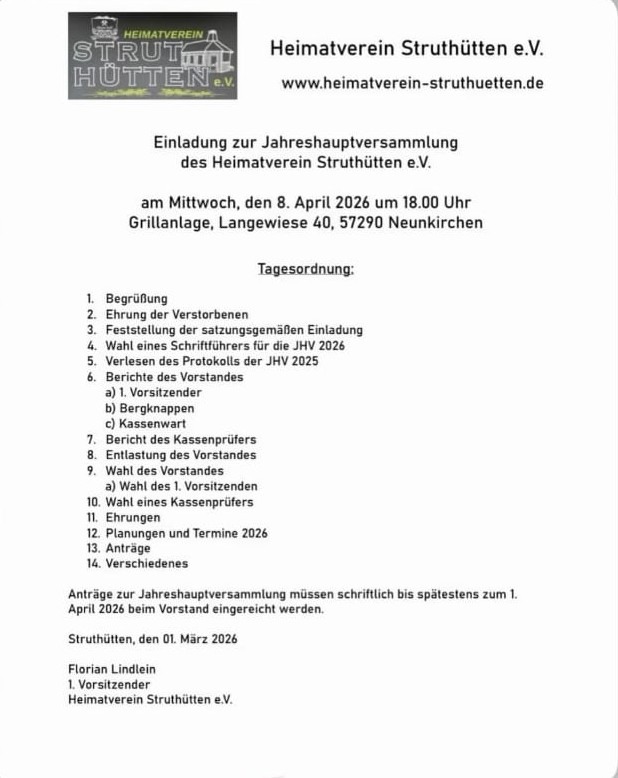 Grillanlage Langewiese 40, 57290 Neunkirchen-Struthütten, NRWHerzliche Einladung an alle Mitglieder zur Jahreshauptversammlung 2026! 8. April 2026 um 18 Uhr in der Grillanlage im Kunstertal Wir freuen uns über zahlreiches Erscheinen. Im Nachgang gibt’s noch Wurst, Getränke und ein gemütliches Zusammensitzen. #heimatvereinstruthütten #liebedeineheimat #ehrenamtverbindet